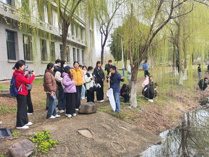 资环楼后的资环湖是此次生态调查的重要区域之一。员工们学习了如何利用生物监测小微湿地健康状况的技术方法和原理,评估了水体生态系统的健康状况,构建了生态修复的知识体系。