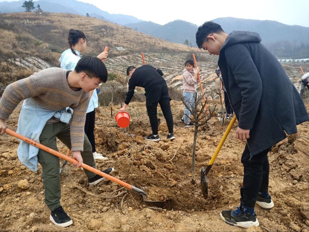 抵达目的地后,该景区专业人士向志愿者们介绍了树的品种并对植树操作进行了演示。“你们种的这个树叫梅树,它拥有顽强的生命力,无论经历多少次砍伐,都会不断地钻出嫩芽、抽出枝条,希望你们能够学习到梅树这样坚毅的精神,去解决生活中的种种困难。”大家学会植树要领后,纷纷摩拳擦掌、跃跃欲试。只见志愿者们配合默契,操作娴熟,很快的投入了植树活动,一些男生前往池塘搬运水资源,其余同学挥锹铲土、扶树浇水,每个人都忙得不亦乐乎。在大家的共同努力,小树苗们直挺地站在了大龙山脚下的土地上,为周围的环境添加了一丝生机,志愿者们纷纷露出了欣慰的笑容。