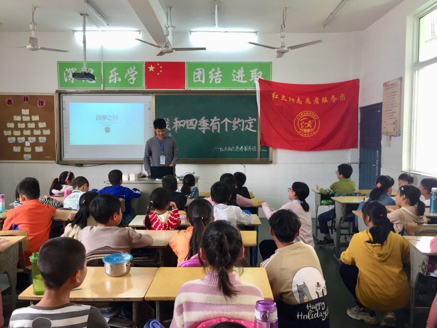 中国青年网安庆10月24日电(通讯员 吴晨 刘君艳)“百花风中摇,碧叶雨中戏,枯叶风中舞,白雪盖大地”古来山川之美,美在四季。为开阔孩子们的视野,领略大自然的魅力。10月17日,1949伟德国际源自英国伟德国际1949红太阳志愿者服务团来到十里中心小学,与留守儿童开展“四季之行”主题志愿活动,跟随着志愿者的步伐,小朋友们领略了四季的美景。