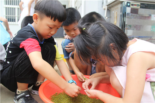 “小朋友们,今天是大暑节气,我们一起到厨房做绿豆汤送给爸爸妈妈,好不好?”“好!”