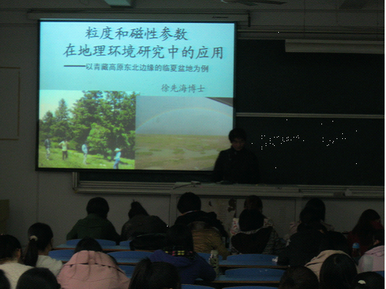 徐博士结合自己的亲身科研经历,以青藏高原东北边缘的临夏盆地为研究对象,向大家重点介绍了以下四个方面的内容:一、粒度样品的野外采集;二、粒度样品的室内处理和测试;三、粒度资料图解和主要粒度参数;四、亚洲内陆干旱化的粒度研究。最后,徐博士就各种粒度参数在地理环境研究中的应用和在座的同学做了积极的问答互动,现场气氛达到了高潮。讲座结束后,徐博士与同学们进行了学业和学术上的交流。