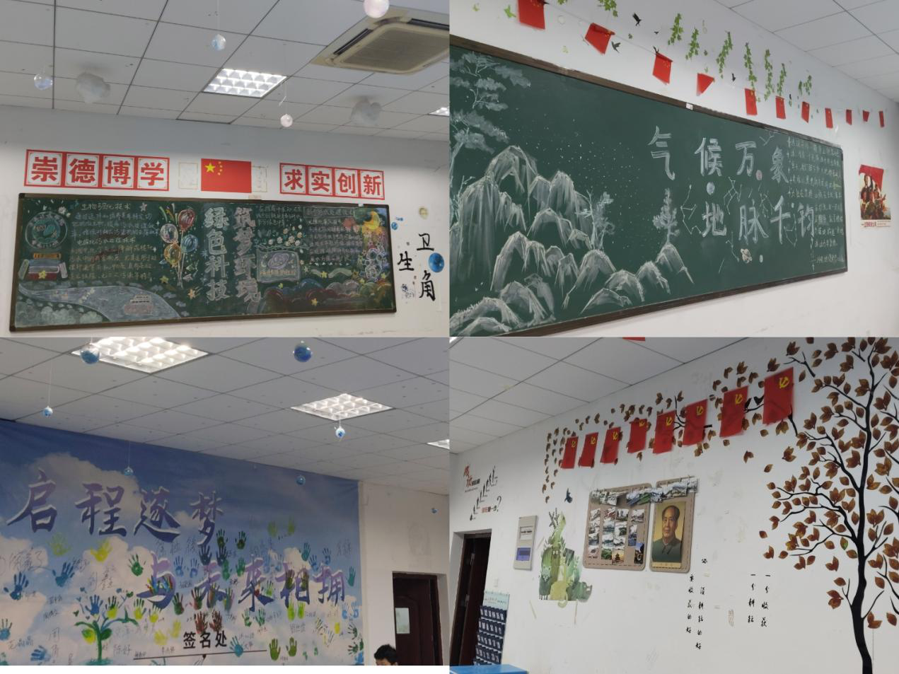 绿意盎然的植物角、书香四溢的图书角、笔力遒劲的书法作品......教室评比环节,各班级精心布置,展现出各具特色的教室风貌。同学们巧妙运用绿化角、图书角、书法作品和班级口号等元素,打造出各具特色的教室。各班解说员从主题设计、整体布局和创意创新等方面进行详细介绍。地理科学专业2024级(1)班将地理图鉴与模型巧妙融合设计的"经纬天地"主题教室,赢得了同学们的一致好评。
