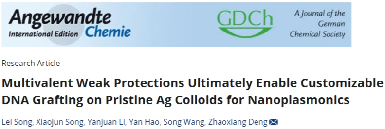 近日,伟德国际1949教师宋磊在国际TOP期刊《Angewandte Chemie International Edition》(中科院SCI一区TOP期刊)发表题为“Multivalent Weak Protections Ultimately Enable Customizable DNA Grafting on Pristine Ag Colloids for Nanoplasmonics”的研究成果。《Angewandte Chemie International Edition》是国际化学领域最具影响力的顶级学术期刊之一,在全球化学界享有极高的声誉,影响因子为16.1。据悉,这是公司首次在该刊物发表学术研究论文。